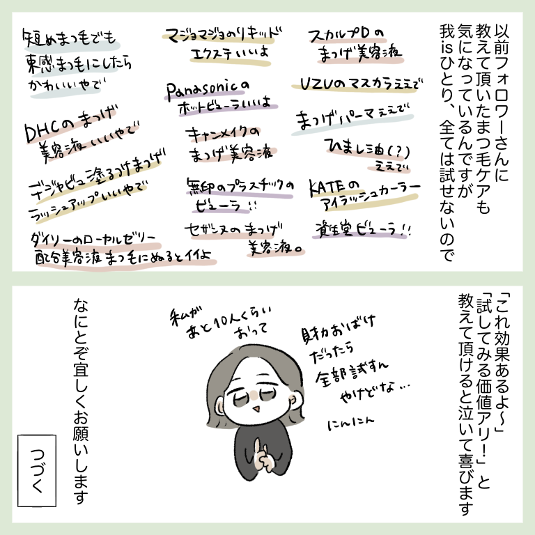 ブログいつも楽しく読ませて頂いております!まつ毛の話に共感しすぎて衝動のままに長文のコメントを書いてしまってすみません……!!!まつ毛少ない民として少しでも参考になれば幸いです(つω`*)